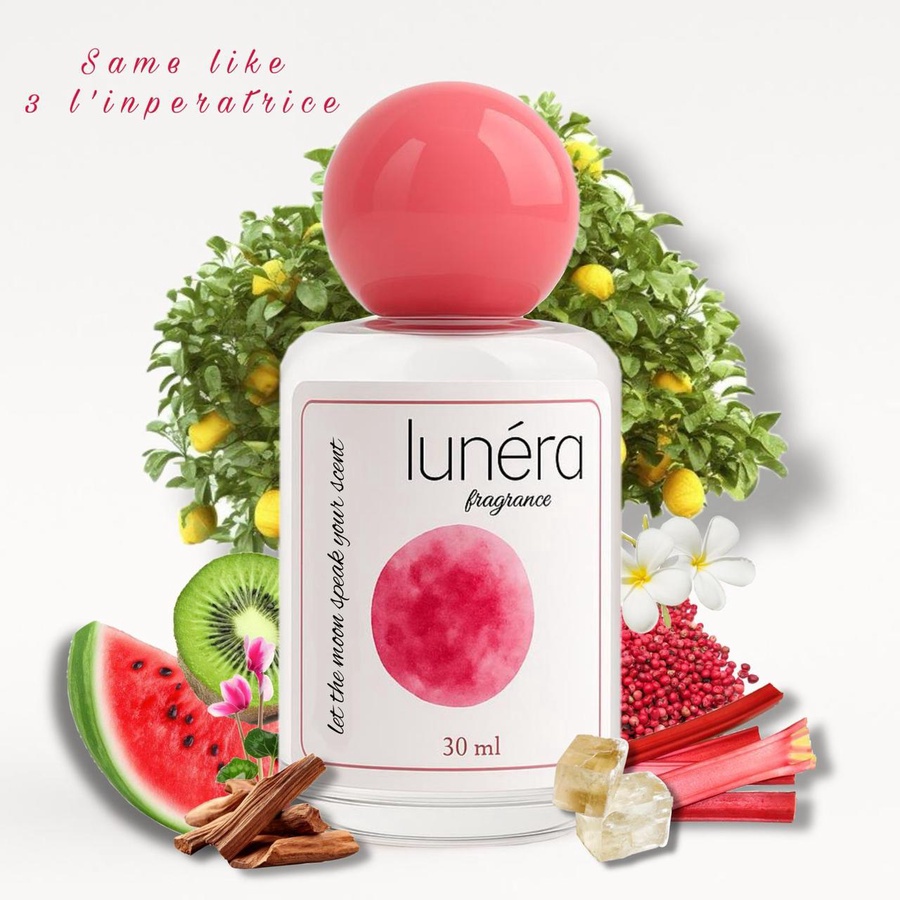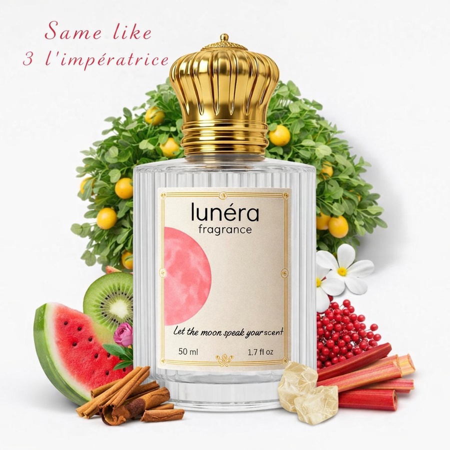 3 L’Impératrice is vibrant, magnetic, and effortlessly confident. It bursts open with juicy notes of kiwi, rhubarb, and red currant—bright and slightly tart for a refreshing first impression. In the heart, delicate florals and watermelon add a playful, luminous softness that feels like sunshine on skin. The base of creamy musk and sandalwood gives it a subtle sensuality that lingers. Joyful and bold, this scent is made for the woman who leads with charm and captivates without trying.