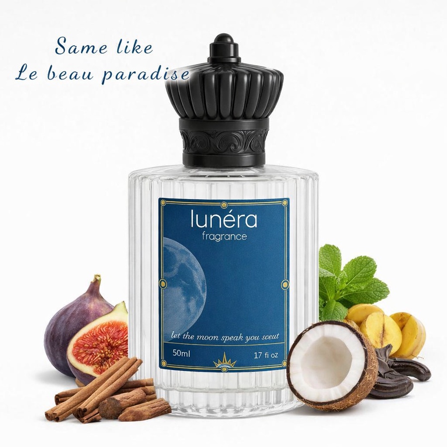 Le Beau Paradise Garden is tropical, seductive, and effortlessly fresh. It opens with a splash of refreshing coconut water and lush greenery, instantly transporting you to an exotic escape. In the heart, ripe fig and soft florals add a sensual sweetness, evoking sun-warmed skin and hidden gardens. The dry-down is creamy and addictive—sandalwood and tonka bean blending into a smooth, lingering warmth. This fragrance is a paradise in a bottle—bold, carefree, and made for the man who lives to captivate.