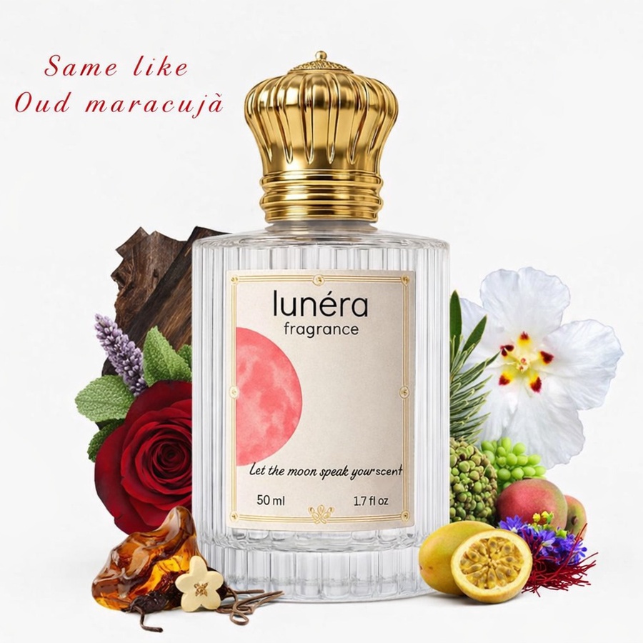 Oud Maracujá is daring, exotic, and luxuriously modern. It opens with a vibrant burst of juicy passion fruit and a hint of saffron, blending tropical brightness with rich spice. As it unfolds, velvety rose and resinous benzoin add depth and sensuality, wrapped in a warm woody heart. The dry-down reveals an elegant contrast—smoky oud and supple leather softened by amber and patchouli, creating a bold yet smooth finish.