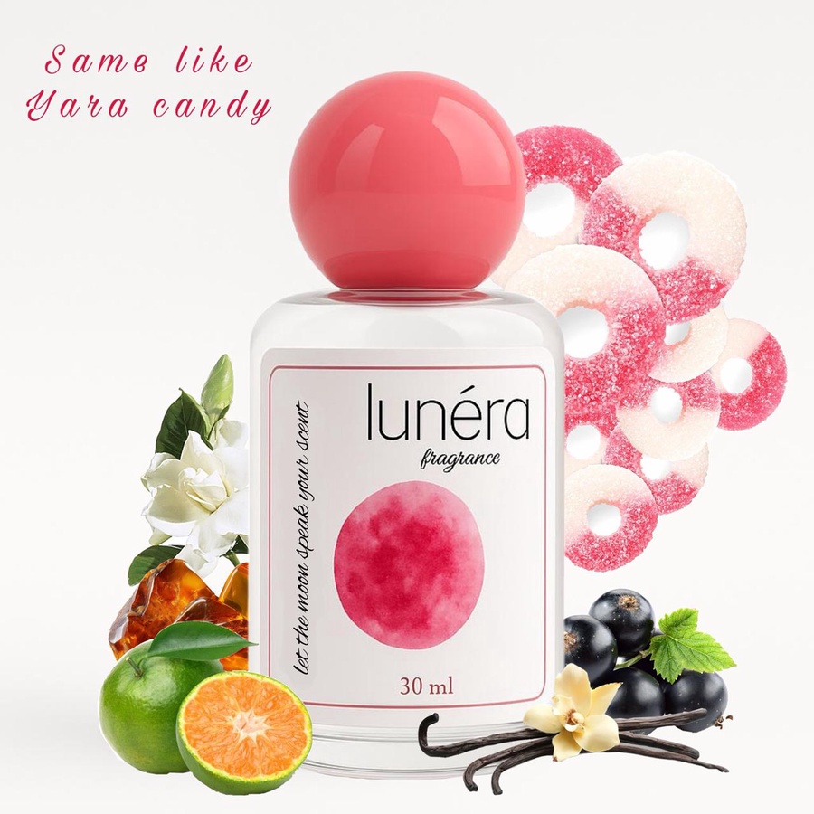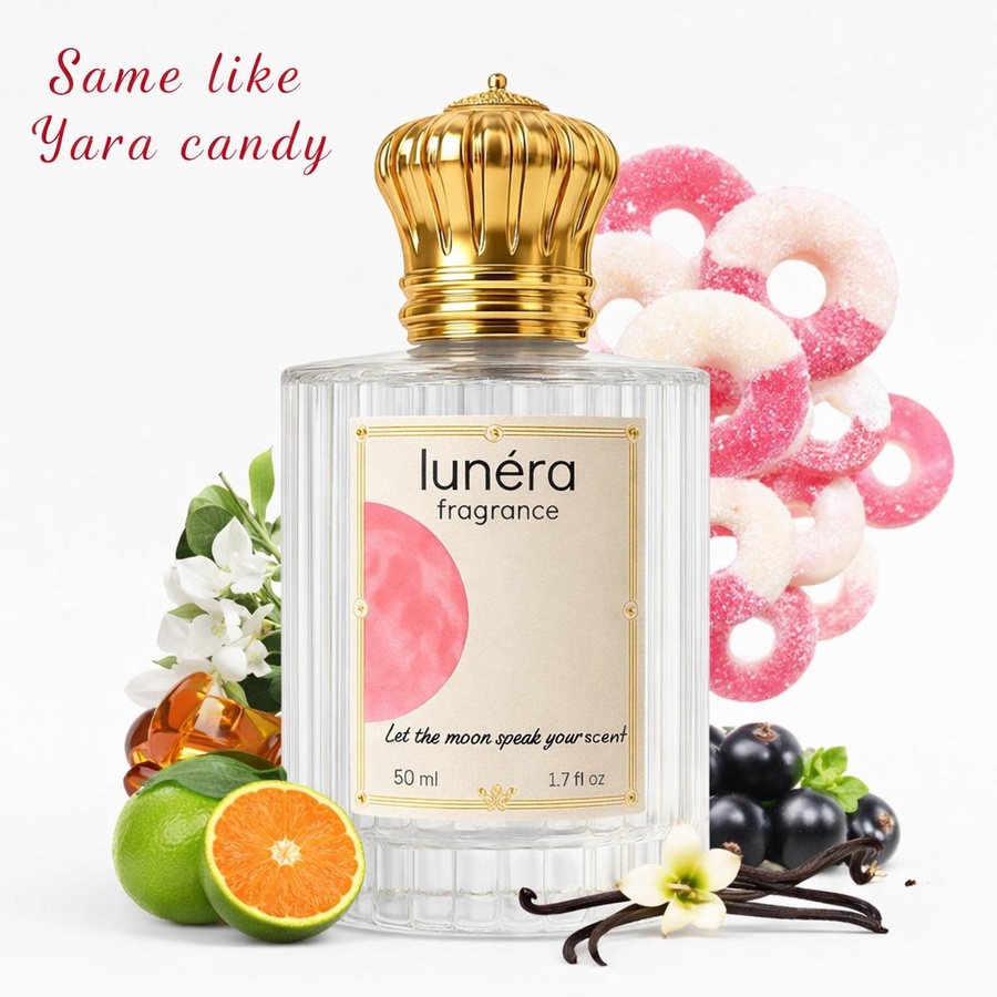 Yara Candy is playful, bubbly, and delightfully sweet — like wearing your favorite candy in perfume form. It opens with a juicy, zesty burst of green mandarin and blackcurrant, giving a fresh yet sugary first impression. Then comes the heart: fizzy strawberry candy meets soft, creamy gardenia, blending fruity sparkle with a floral twist. The dry-down is warm and comforting, with rich vanilla syrup, smooth sandalwood, musky softness, and a touch of amber to anchor the sweetness.